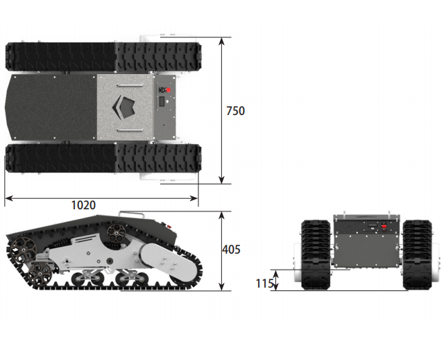 底盘设计注重低重心和通过性,尺寸为1020×750×405mm,自重120kg,离地高度115mm,最大跨越高度小于300mm,最大爬坡角度可达30°。履带采用优质橡胶内嵌天然纤维材质,主体结构使用不锈钢304、合金钢板、镀锌管和铝材组合,表面经过黑色喷塑磨砂处理,不仅耐用且具备IP54防护等级(可升级至IP64)。运行速度范围为0-6km/h,最大载重100kg,内仓尺寸320×240×600mm(不含电池),便于集成各种设备。